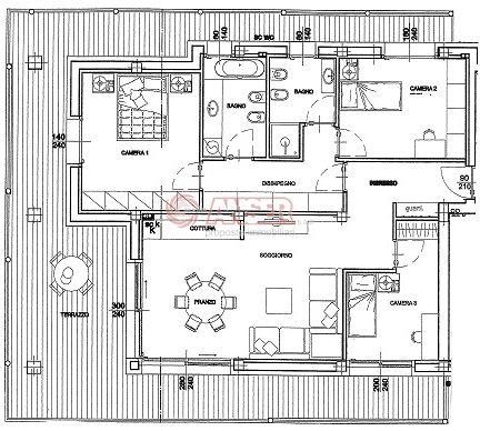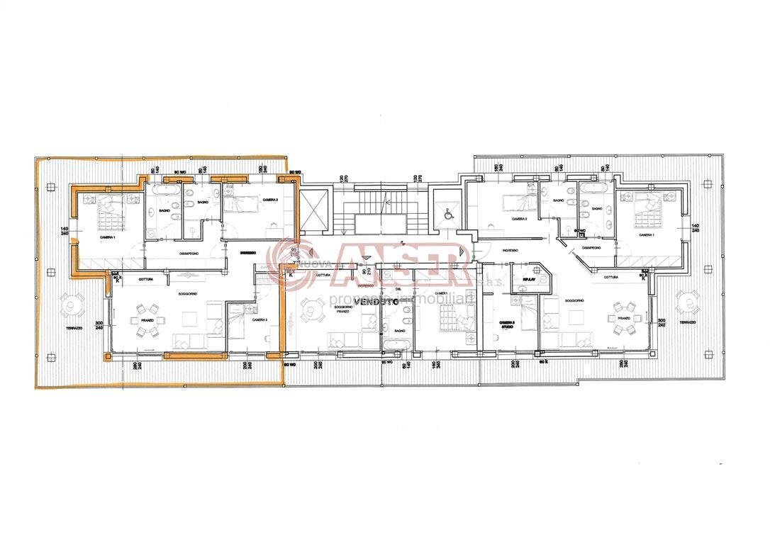 Luminoso quadrilocale mq. 128 ca. circondato da un meraviglioso e godibile terrazzo di mq. 65 ca. composto da: ampio open space con soggiorno / cucina con grandi vetrate che accedono al terrazzo coperto – tre ampie camere - doppi servizi finestrati – Le suddivisioni e le finiture interne sono totalmente personalizzabili con materiali a scelta dal capitolato predisposto dalla Direzione Lavori.